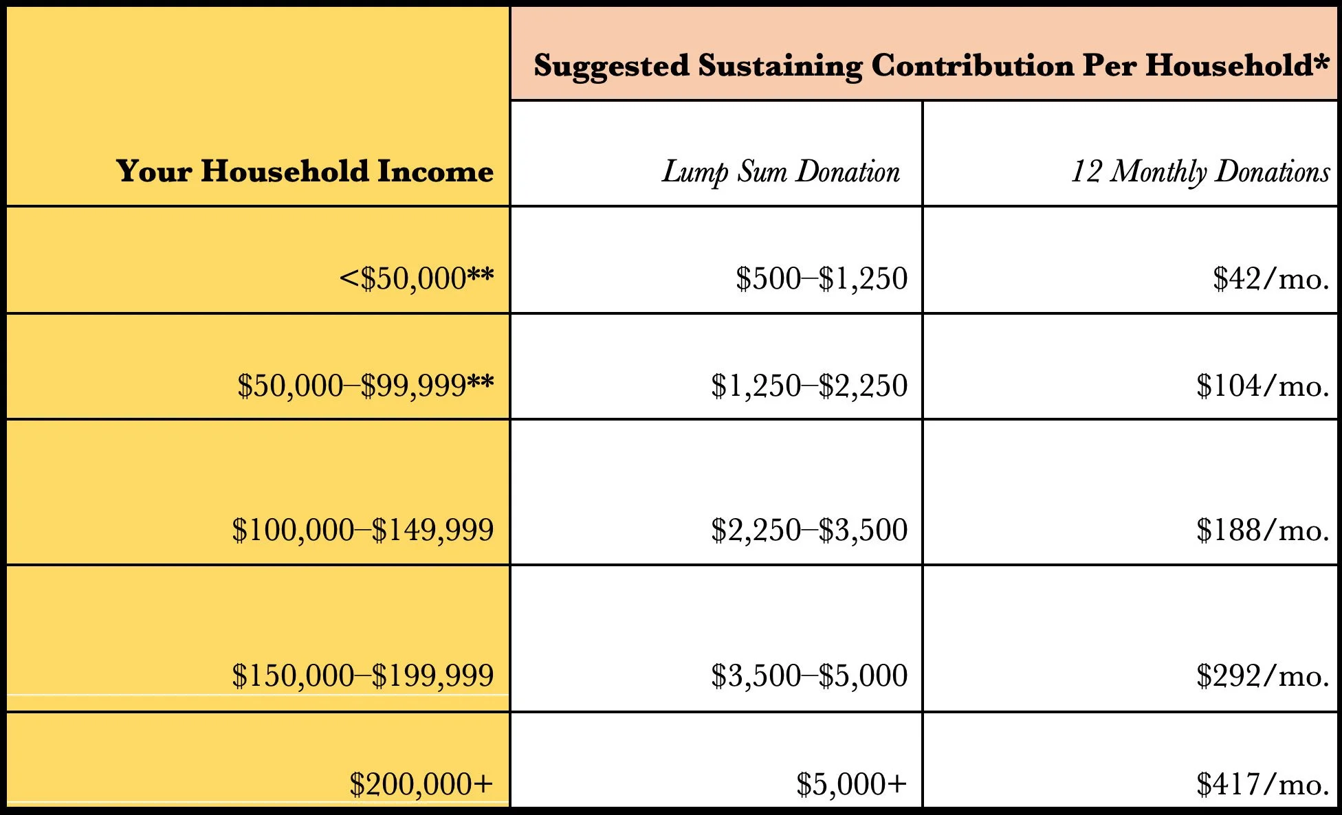 Each household’s financial circumstances, obligations, and ability to give are different. Only you can decide what amount is right for your sustaining contribution. However, please refer to this sliding scale to review your suggested annual contribution amount based on your household income. (Please note that the suggested contribution amounts are per household not per pupil.)